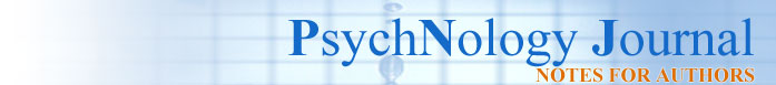 Abstracts for review or theoretical articles are generally about 75-100 words. They include the following information: - the topic in one sentence - purpose, thesis, or organizing construct and the scope (comprehensive or selective) of the article - sources used (e.g., personal observation, published literature) - conclusions. Top of the page | | | | TABLES AND FIGURES | | | Tables and figures should be used only when they can present information more effectively than in running text. Care should be taken to insure that tables can be effectively presented .pdf format. Legends should be at the bottom of each table (Arial 11pt bold). They should be provided as separate files, with the specification of the point in the text in which they are to be inserted. They should be numbered in series and all legends should be included at the bottom of each figure (Arial 11pt bold). Please review all figures after converting to GIF or JPEG format to ensure that they are readable. Colors can be used; however, authors should take into account that if the material is printed, colors will be translated into grayscale. Top of the page | | | | PHOTOGRAPHS | | | Photographs can be accommodated as separate GIF or JPEG files; authors should carefully crop images prior to saving as files. Remember that the smaller and fewer GIFs or JPEGs in the paper, the more quickly the paper can be downloaded. Top of the page | | | VIDEOCLIPS | | | The preferred format and size of videos are the following: mpeg,2-5 MegaByteS Top of the page | | | | FORMULAE AND EQUATIONS | | | Mathematical equations should be arranged to fill the width of a single column. Subscripts and especially superscripts (i.e. exponents) should be written with care. All signs such as +, -, =, <, or > should be spaced, but the components of mathematical products should not be spaced. Do not use multiple lines unnecessarily. In order to avoid errors, it is important that all formula matter be carefully arranged with special attention paid to correctness of symbols, location of subscripts and superscripts. Note that we would prefer any complex equation to be rendered as a GIF or JPEG image. Top of the page | | | | COPYRIGHTED MATERIAL | | | Authors who want to make use of artwork already published are required by copyright law to ask the owner of the copyright (usually the publisher) for permission to do so. Please be careful to assign proper credit; for example, in the legend of a figure "...from (reference); reproduced by permission of...." If any verbatim quotations of text amount to more than a few words, the same procedure should be followed. If authors use material from their own published work, permission must be obtained from the publisher. If an article is accepted for publication the author must provide the copyright permissions for already published material. If the author receives permissions faxed from the permission grantor, (s)he may fax or mail these permissions to us. Video: video can be provided as separate files, 2-5 MegaByte size and mpeg format; authors should specify where in the text of their manuscript they wish to place the link to the video. Before submitting your paper to PsychNology Journal, please be sure to proofread and spell check your article. Top of the page |